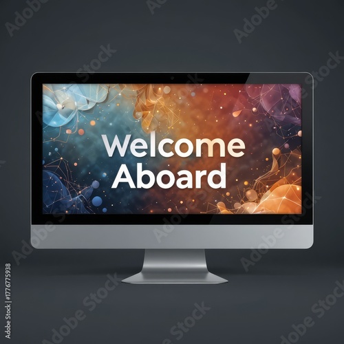 Desktop Monitor showing Welcome Aboard message for new hire, new hire welcome aboard greeting on computer monitor, corporate new hire welcome message on grey background