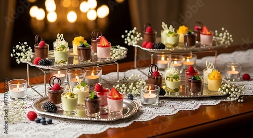 Dessert Display: A captivating arrangement of assorted desserts graces a refined table setting. Artfully presented in elegant glassware. Illuminated by the soft glow of candlelight.