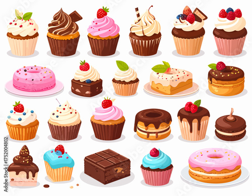 dessert, set, cupcake, vector, illustration, donut, cake, icon, sweet, food, cartoon, snack, pastry, bakery, isolated, cafes, menu, tasty, party, chocolate, eat, cream, candy, collection, holiday, decoration, celebration, background, graphic, realistic, three-dimensional, croissant, donut, birthday, eatery, glaze, delicious, pink, breakfast, signs, lollipop, cookie, muffin, sugar, icing, frosting, treat, confectionery, flat