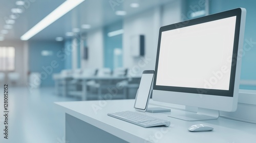 Destkop monitor, white keyboard, mouses and smartphone with blank white screen. Background blurred white desk modern office