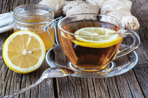 detail of cup of ginger tea with lemon and fresh ginger on wooden cutting board