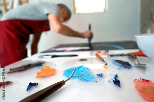 art, artist, paint, oil, painter, colours, creative, artistic, colourful, education, object, girl, woman, studio, brush, leisure, palette, drawing, hand, craft, workshop, tool, paintbrush, design, hobby, brush, work, picture, hand-made, acrylic, indoor, painting, craft, creativity, people, imagination, background, workspace, bright
