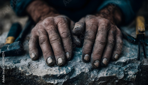 Detail shot of weathered hands on stone, tools in background. Symbolizes hard work, perseverance, and strength. Evokes resilience, determination and craftsmanship