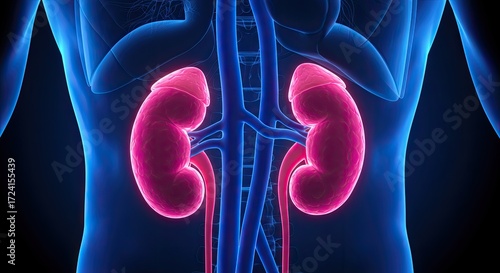 kidney, bod, anatomy, medicals, health, organ, biological, physiology, urology, aorta, artery, vein, red, pink, blue, semitransparent, glowing, illustration, science, health care, body, system, excretion, filtration, hormone, renal, lumbar, back, silhouette, diagram, visualisation