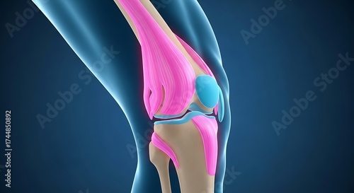 Detailed 3D Rendering of Human Knee Joint Anatomy with Luminous Tendons and Cartilage.
