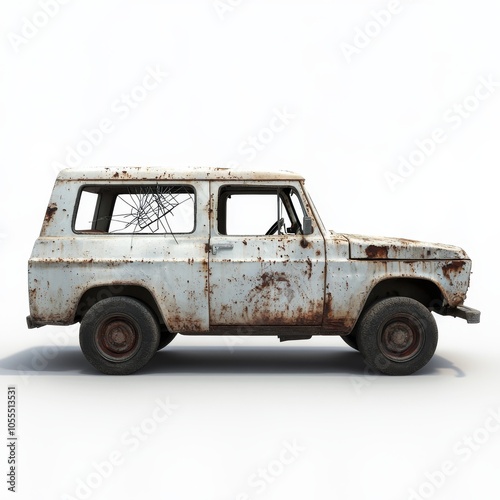 Detailed 3D-Rendered Damaged Vehicle with Broken Window on White Background