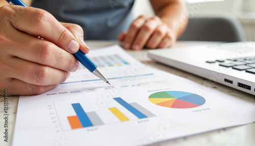 Detailed analysis of graphs on documents at a desk, data evaluation