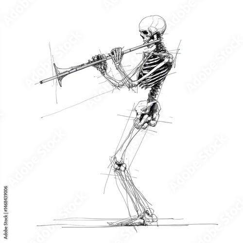 skeleton, drawing, anatomy, illustration, musical, instrument, horn, detailed, black, white, figure, art, line, design, study, anatomical, playing, music, bone, flute, graphic, rendition, outline, crayons, vignetting, artistic, composition, creative, human, image, performance