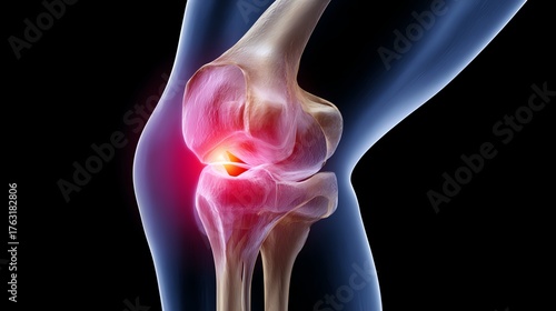 Detailed anatomical illustration of a human knee joint, highlighting pain points in red. Useful for educational purposes regarding joint health and injury prevention.