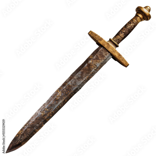 Detailed, ancient sword with weathered blade and ornate hilt, showcasing historical craftsmanship and sense of adventure
