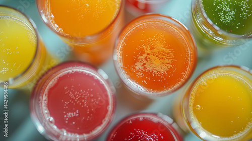 Detailed and Overhead Shots of Vibrant Fruit Juices in Transparent Cups