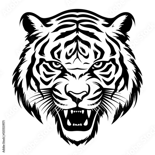 Detailed black and white illustration of a tiger head, perfect for graphic design and wildlife projects.