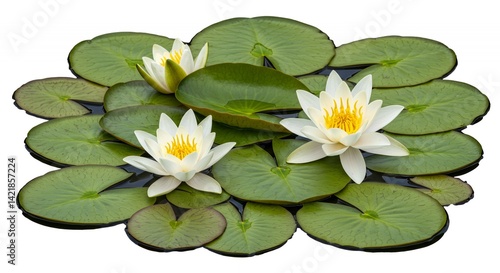 Detailed Botanical Isolated White of Water Lily Nymphaea Alba Emphasizing Floating Leaves and White Flowers with Yellow Centers in a Clean Presentation Perfect for Decoration