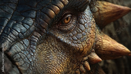 Detailed close-up of a dinosaur's eye with scaly skin and sharp horns