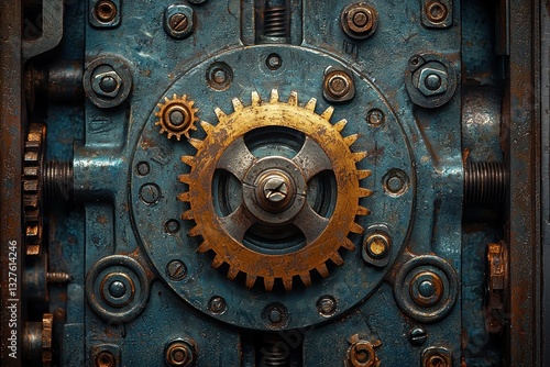 gear, machinery, mechanism, metal, antique, clockwork, vintage, industrial, rust-eaten, cog, intricate, design, detail, engineering, technology, complex, precision, component, metalwork, old, part, system, motion, power, construction, work, texture, close, up, aged, brass, blue, gold