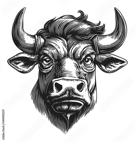 Detailed Engraving of a Bull's Head with Realistic Features