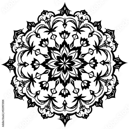 Detailed floral mandala arrangement in black and white creating a complex symmetrical pattern on white background