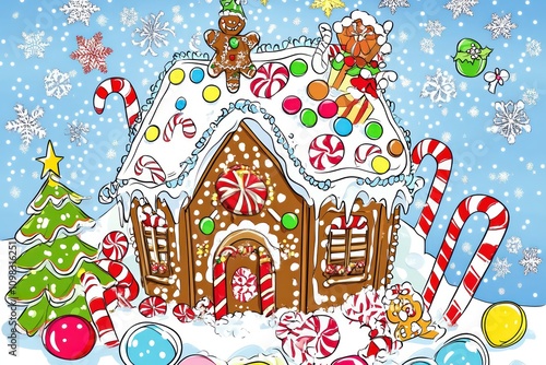 detailed gingerbread house with candy canes gumdrops and festive characters line drawing for coloring book