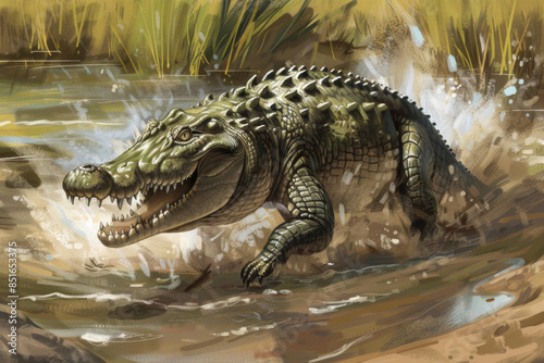 crocodile, river bank, natural, habitat, wildlife, reptile, predator, aquatic, animal, detailed, art, nature, drawing, water, swamp, marsh, scale, teeth, eye, claw, skin, texture, wetland, river, bank, danger, wild, carnivore, green, brown, camouflage, fauna, ecosystem, conservation, environment, tropical, riparian, sunlight, basking, resting, lurking, territorial, solitary