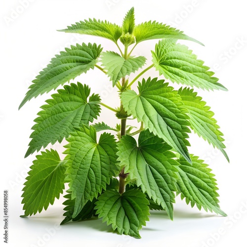 Detailed image of a vibrant green stinging nettle plant featuring toothed leaves. On a white background