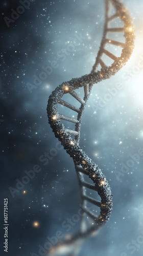 Detailed image of complex DNA strand interwoven with shimmering particles, set against cosmic background filled with stars and ethereal light, evokes sense of wonder and discovery