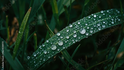 Detailed image of tiny water droplets shimmering on a fresh green leaf, revealing the complexity and charm of dawn's moisture.