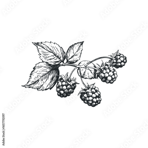 Detailed Ink Drawing of a Raspberry Branch with Leaves and Berries