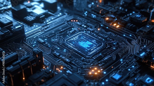 Detailed macro shot of a glowing microchip on a computer circuit board, highlighting technology, electronics, and modern computing