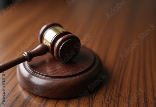 Detailed photo of a wooden gavel with a metallic gold band and matching sound block