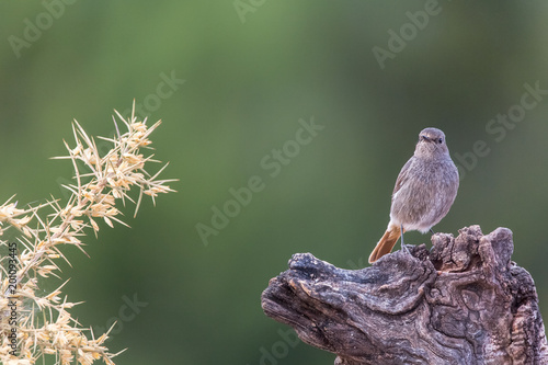 detailed portrait of a female black redstart (Phoenicurus ochruros) perched on a log.