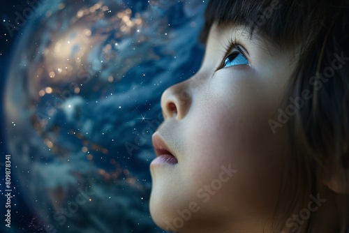 Detailed shot of a child's face, with the Earth floating above, enveloped by the vastness of space in the background