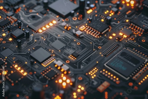Detailed shot of a circuit board with illuminated pathways and microchips, symbolizing advanced electronics
