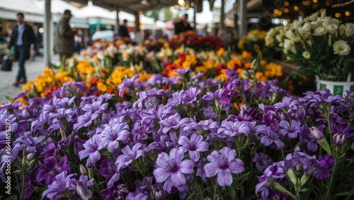 Detailed shot of vibrant purple and violet blossoms displayed at an outdoor floral market stall.