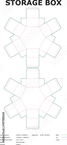 Detailed vector illustration of a storage box template with dimensions and guidelines for crafting and packaging.