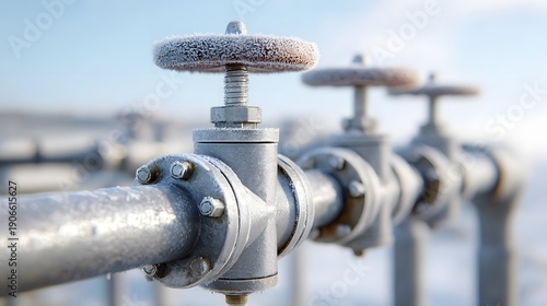 Detailed view of a cold industrial pipeline system with frost covered valves and connections highlighting the harsh winter weather conditions and the robust engineering of the infrastructure