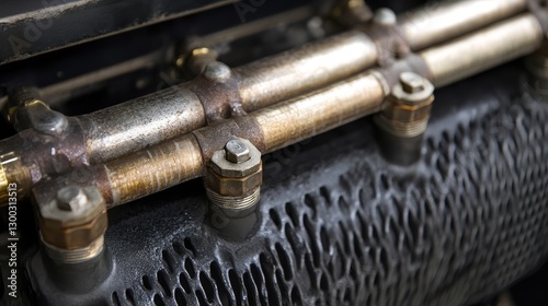 metal, copper, brass, engine, machine, mechanism, pipe, nut, bolt, closeup, detailed, industrial, antique, aged, weathered, rivet, grey, gold, brown, rust, steam, power, vintage, classic, intricate, technology, engineering, hardware, mechanical, assembly