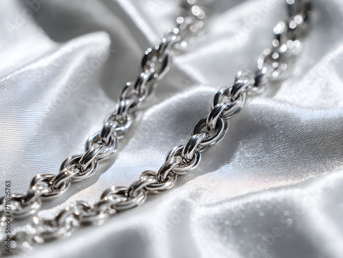 Detailed view of a silver chain on white satin fabric