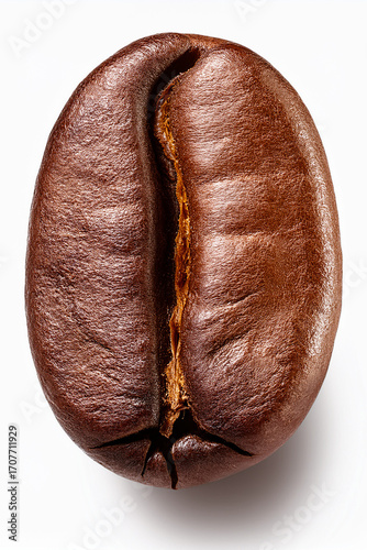 Detailed view of a single roasted coffee bean, showcasing its natural oils and groove, ideal for educational content on food and agriculture.