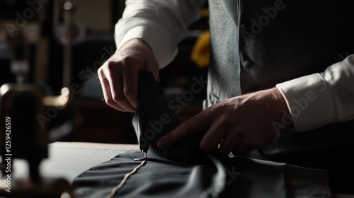 Detailed view of a tailor sewing a garment in a studio showcasing tailoring skills and tools. Ideal for fashion and apparel themes with detailed tailor's hands using a sewing machine.