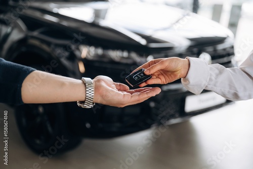 Detailed view of hands of customer that is taking keys for new purchased car