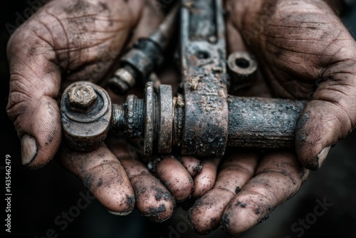 Detailed view of soiled hands holding an old rusted metal part, concept for repair shop, mechanic, or industrial maintenance.