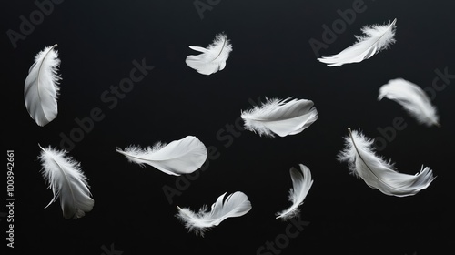 Detailed white feathers floating gently above a matte black surface, highlighting their delicate and graceful nature