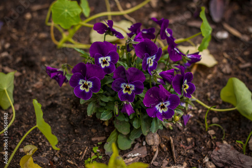 Details of beautiful natural colors with a blurred background. Bright flowers of pansies. Space for copying.