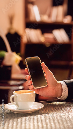 Detalhe de mão com celular na mão em um café para reunião de negócios