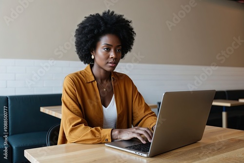 Determined African American Professional Using Laptop in Sleek Minimalist Cafe