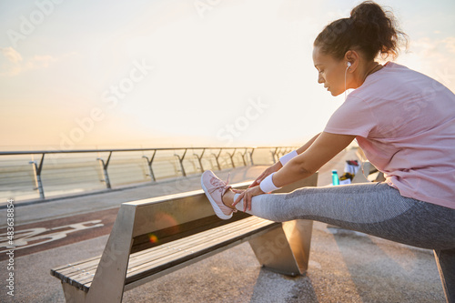 Determined female athlete, sportswoman stretching legs before morning jog. Sportswoman exercising outdoor, standing on an urban environment and flexing her legs muscles on a wooden bench at sunrise