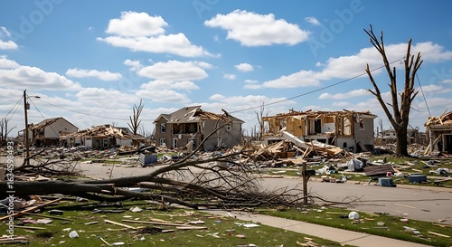 Devastated Neighborhood: Homes Destroyed by Tornado, Debris Scattered.