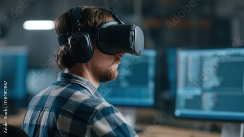 Developer Analyzing Visual and Audio Projects with VR Technology and Computer Screens in a Contemporary Workspace Environment