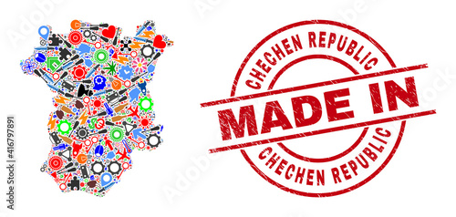 Development mosaic Chechen Republic map and MADE IN scratched stamp. Chechen Republic map mosaic formed with spanners, gear wheels, instruments, aircrafts, transports, electric sparks, details.