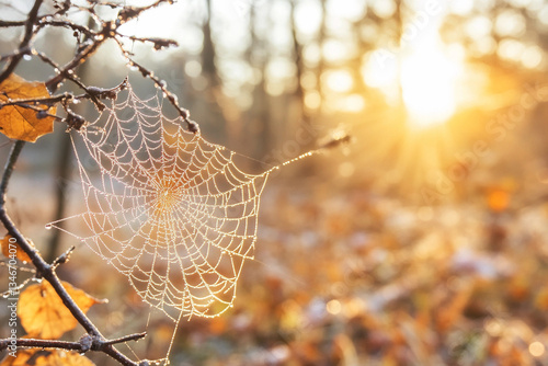 Dew drops glisten on a delicate spiderweb at sunrise in a serene autumn landscape
